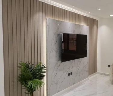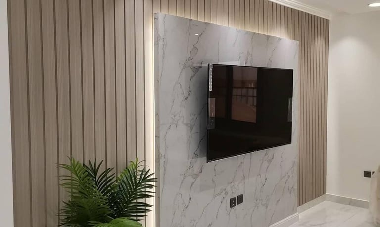 بديل الرخام من الخامات العصرية التي تُستخدم بكثرة في ديكورات الشاشات في أبها، لما يتميز به من مظهر فخم وسهولة تنظيف. نوفر لوحات بديل رخام بألوان متعددة مثل الأبيض العروقي، الرمادي، والأسود المطفي، ويتم تنسيقها مع إنارة مخفية وأكسسوارات ديكورية للحصول على تصميم راقٍ وأنيق يدوم طويلاً