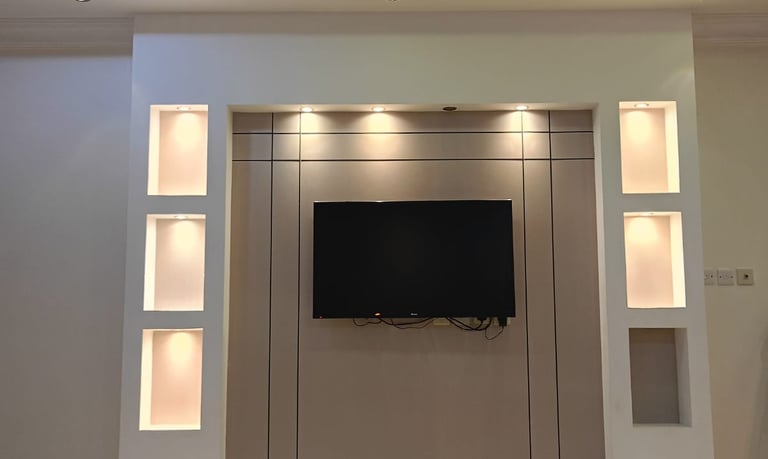 ديكورات الجبس تعتبر من الخيارات الأكثر طلبًا في أبها لتزيين جدران الشاشات، نظرًا لمظهرها الراقي وقابليتها للتخصيص. نحن نوفر ديكورات جبس بورد بدقة عالية مع دمج الإنارة المخفية (LED) التي تبرز جمال التصميم. يمكن تشكيل الجبس بأشكال هندسية، أو خطوط ناعمة، أو حتى إطارات كلاسيكية حول الشاشة، مما يجعل الجدار قطعة ديكور متكاملة تضيف طابعاً فخماً للمكان