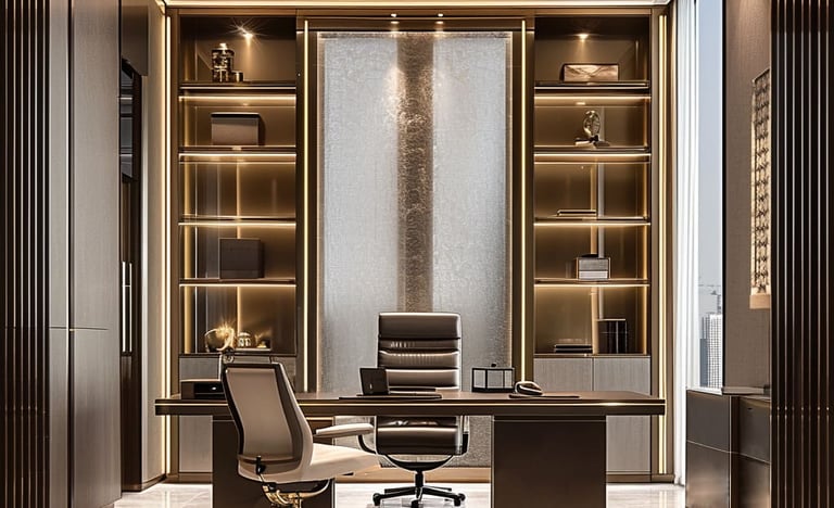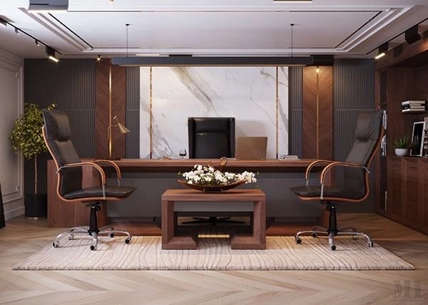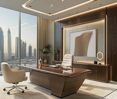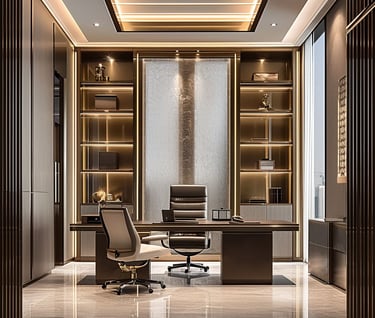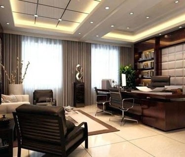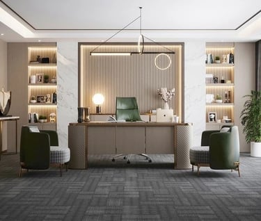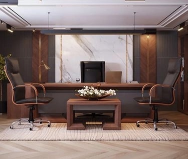 للمناصب الإدارية العليا، نقدم تصاميم مكاتب تنفيذية تجمع بين الفخامة والهيبة، باستخدام خامات مثل الخشب الطبيعي، الأرضيات الفاخرة، والإضاءة الدافئة. هذه التصاميم تعكس مستوى الإدارة وتضيف شعورًا بالثقة والاحتراف