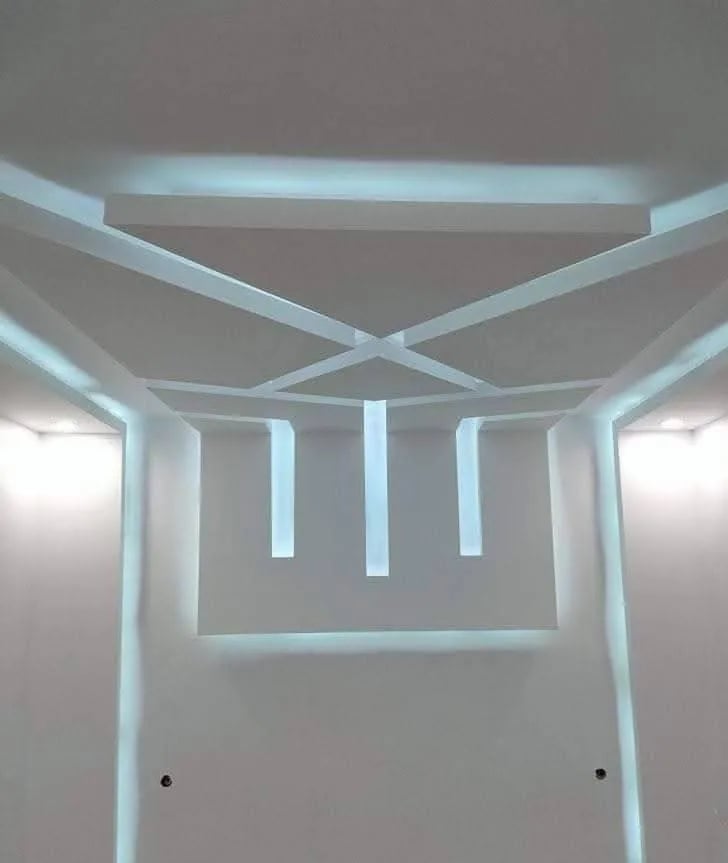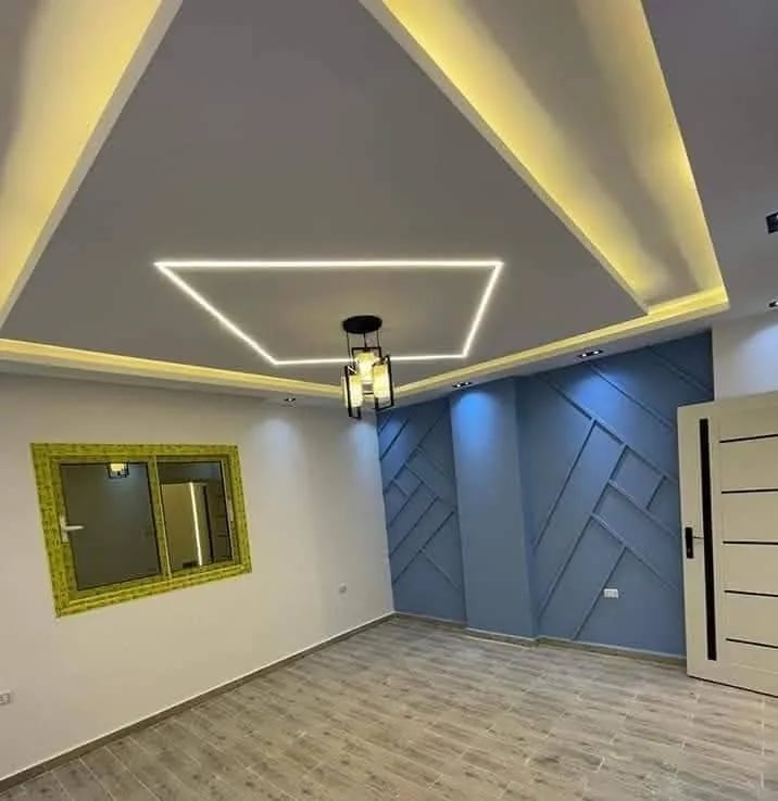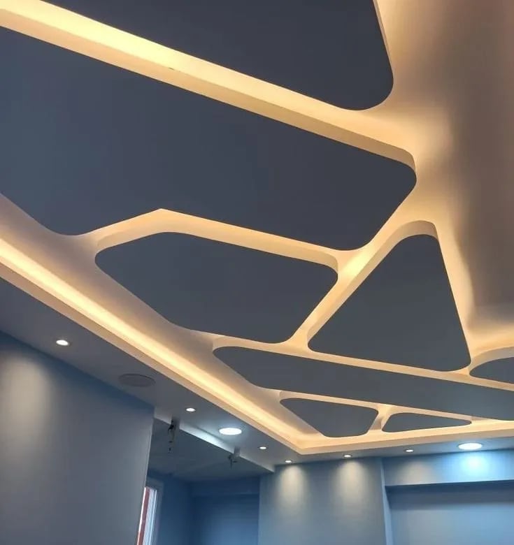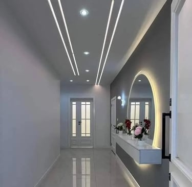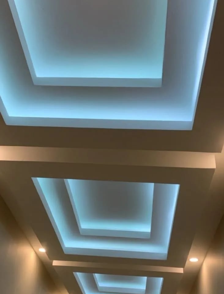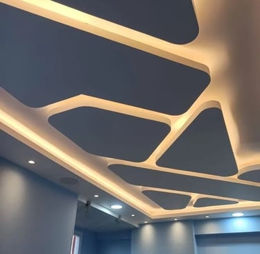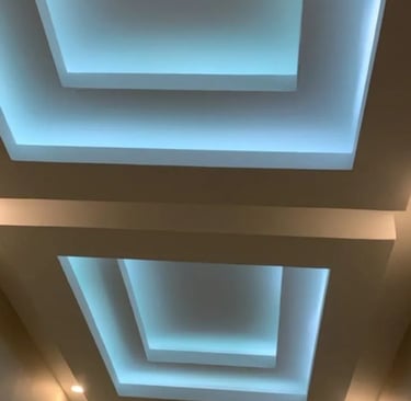 أسقف جبسية (مستوية، متعددة المستويات، مدمجة بإضاءة LED).ديكورات جدران (أفاريز، أعمدة، تيجان، أشكال هندسية مودرن)